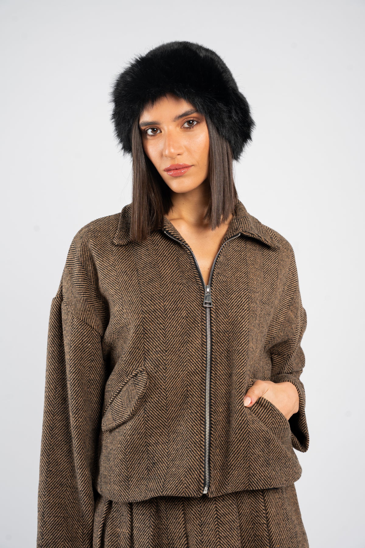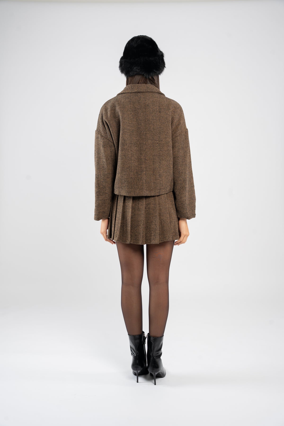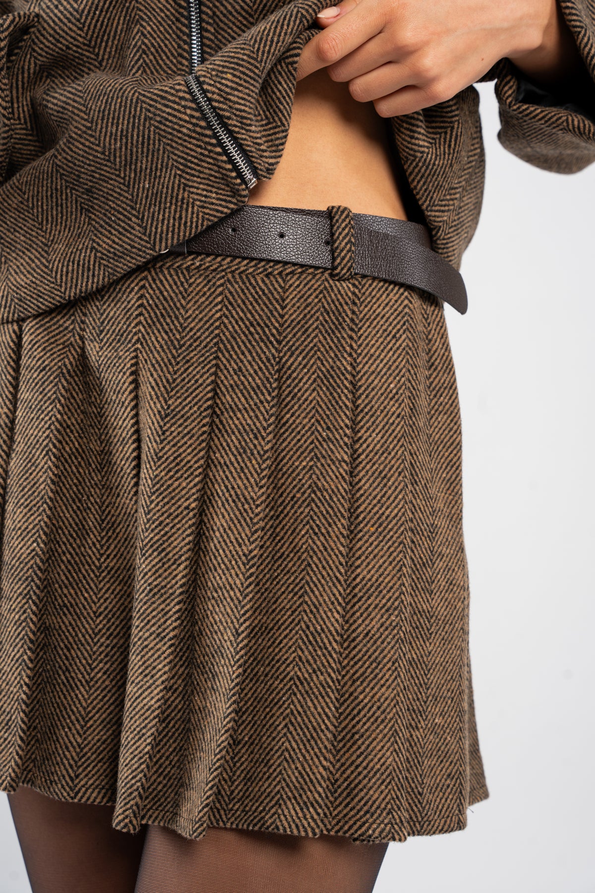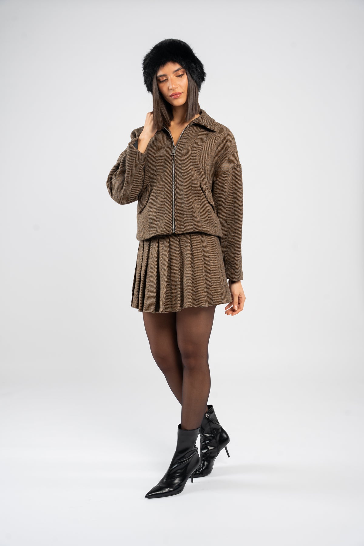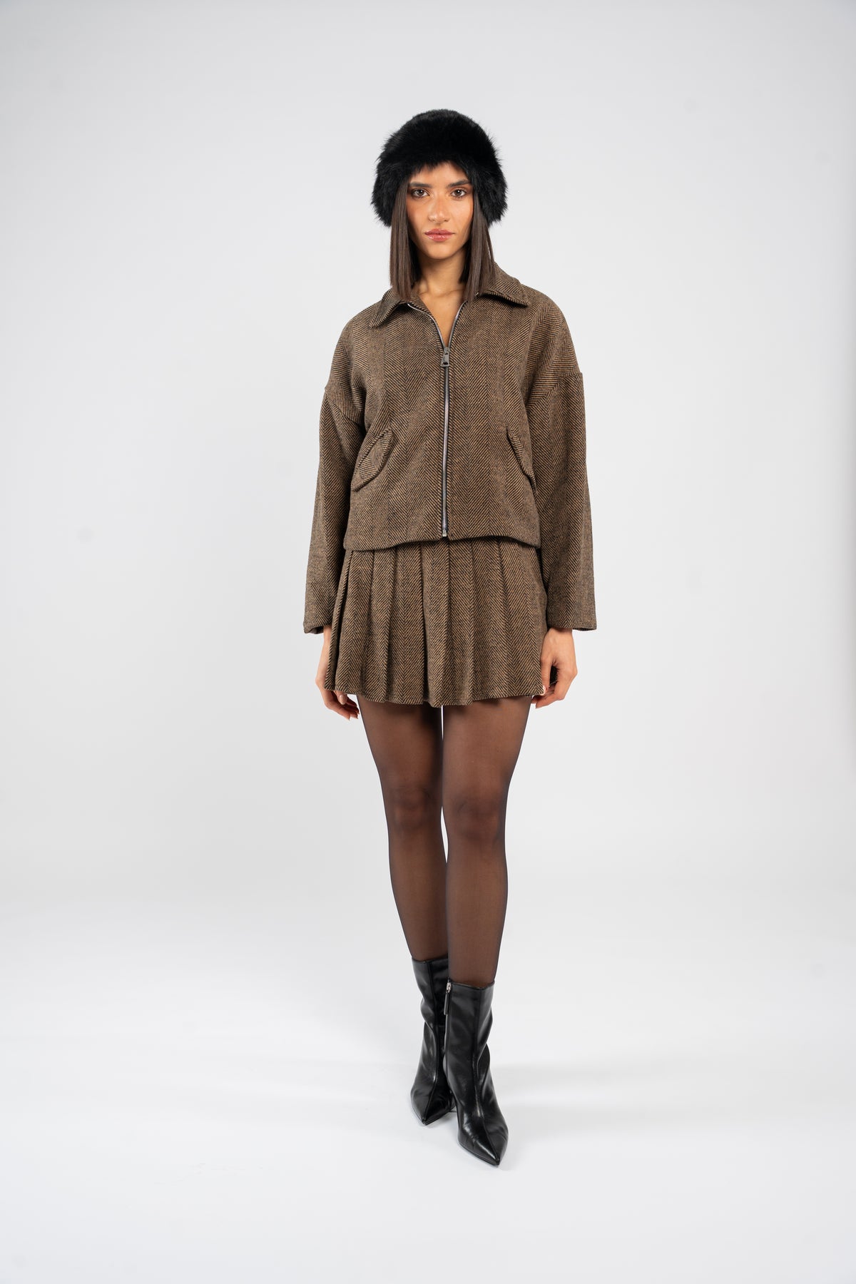 • Zip front jacket paired with a classic pleated mini skirt