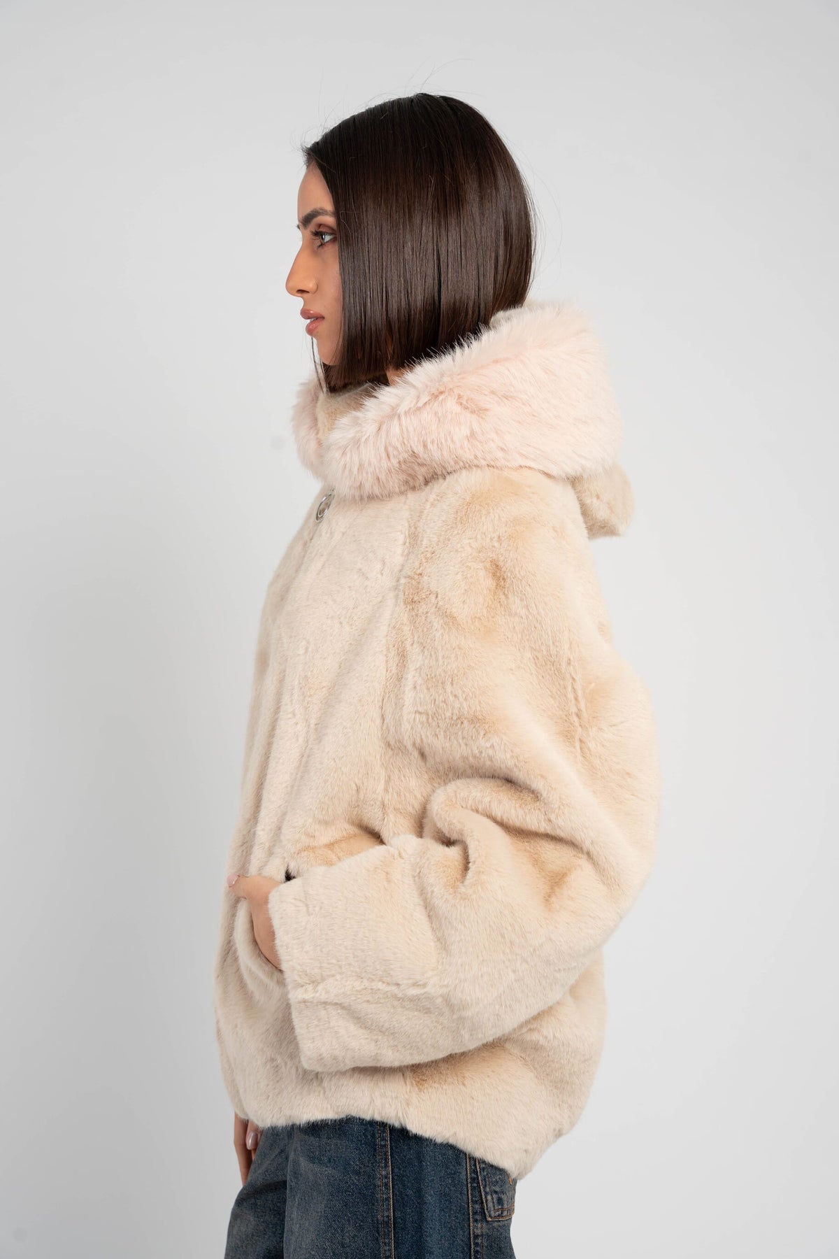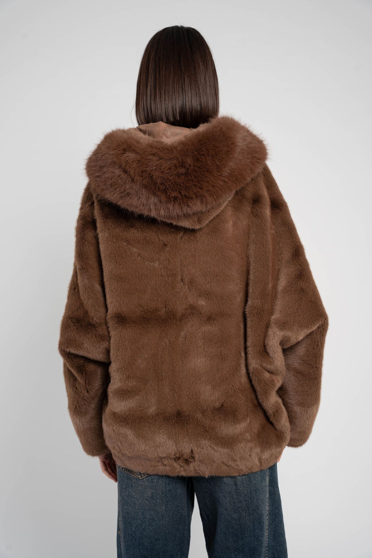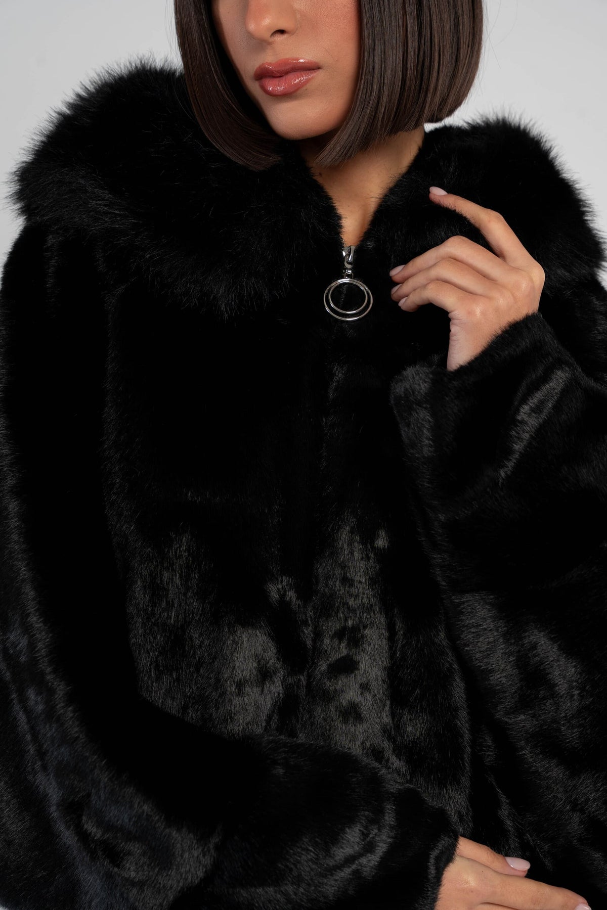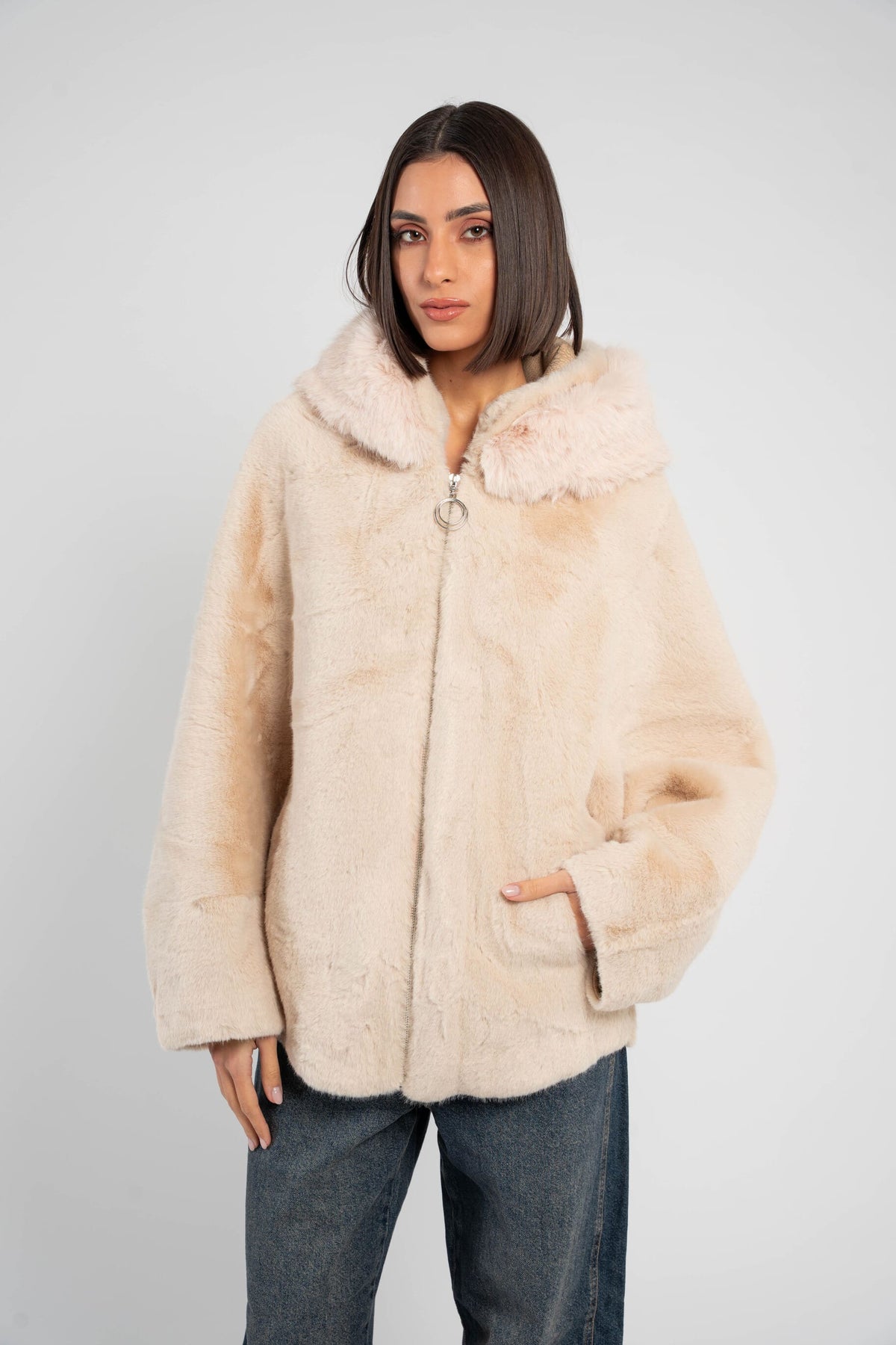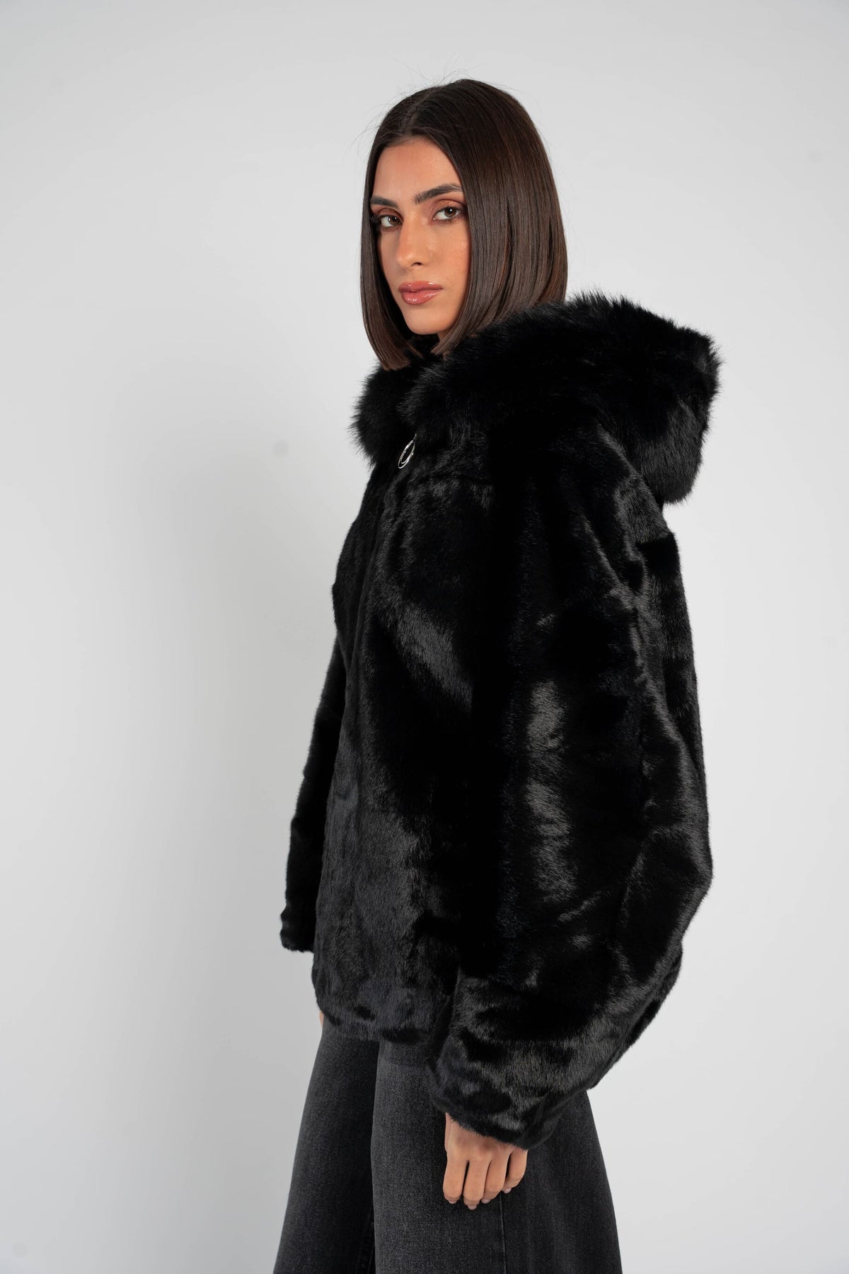 - A cozy faux fur jacket featuring a hooded design, front zip closure, and side pockets