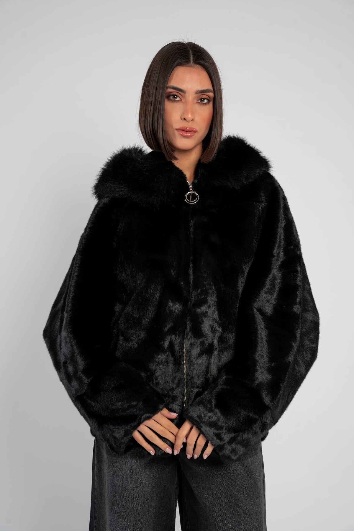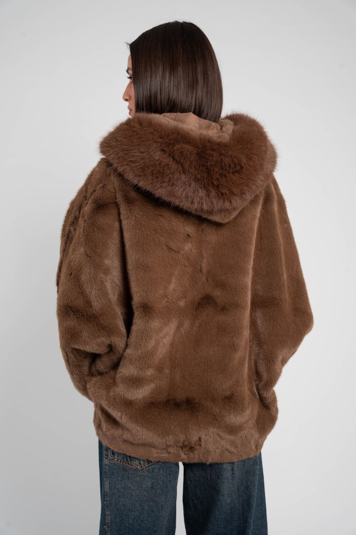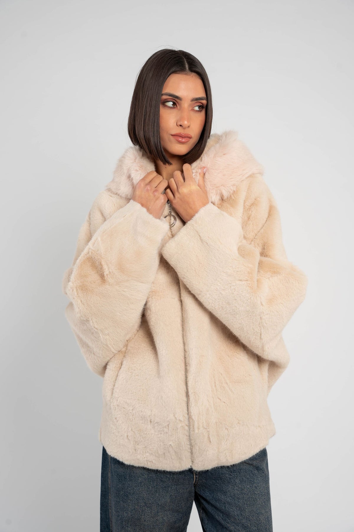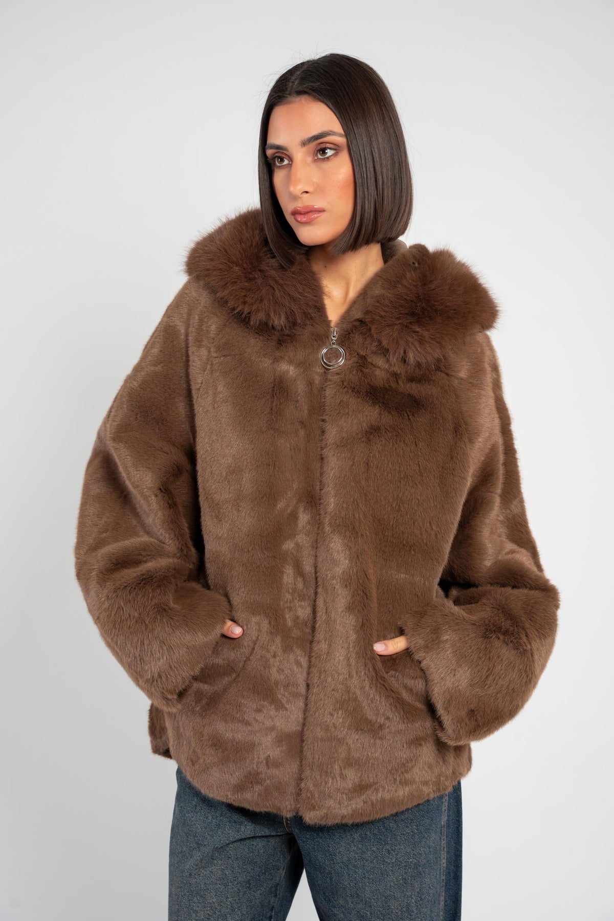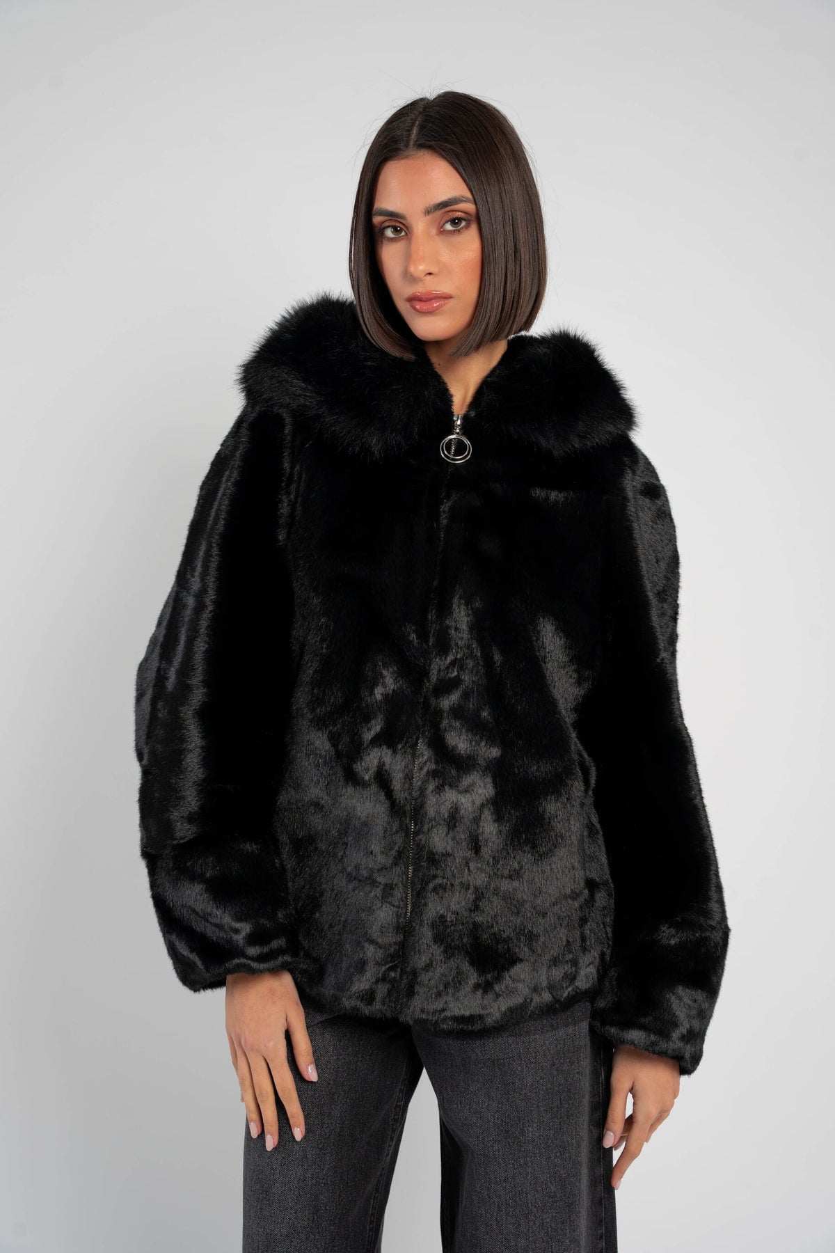 - A cozy faux fur jacket featuring a hooded design, front zip closure, and side pockets