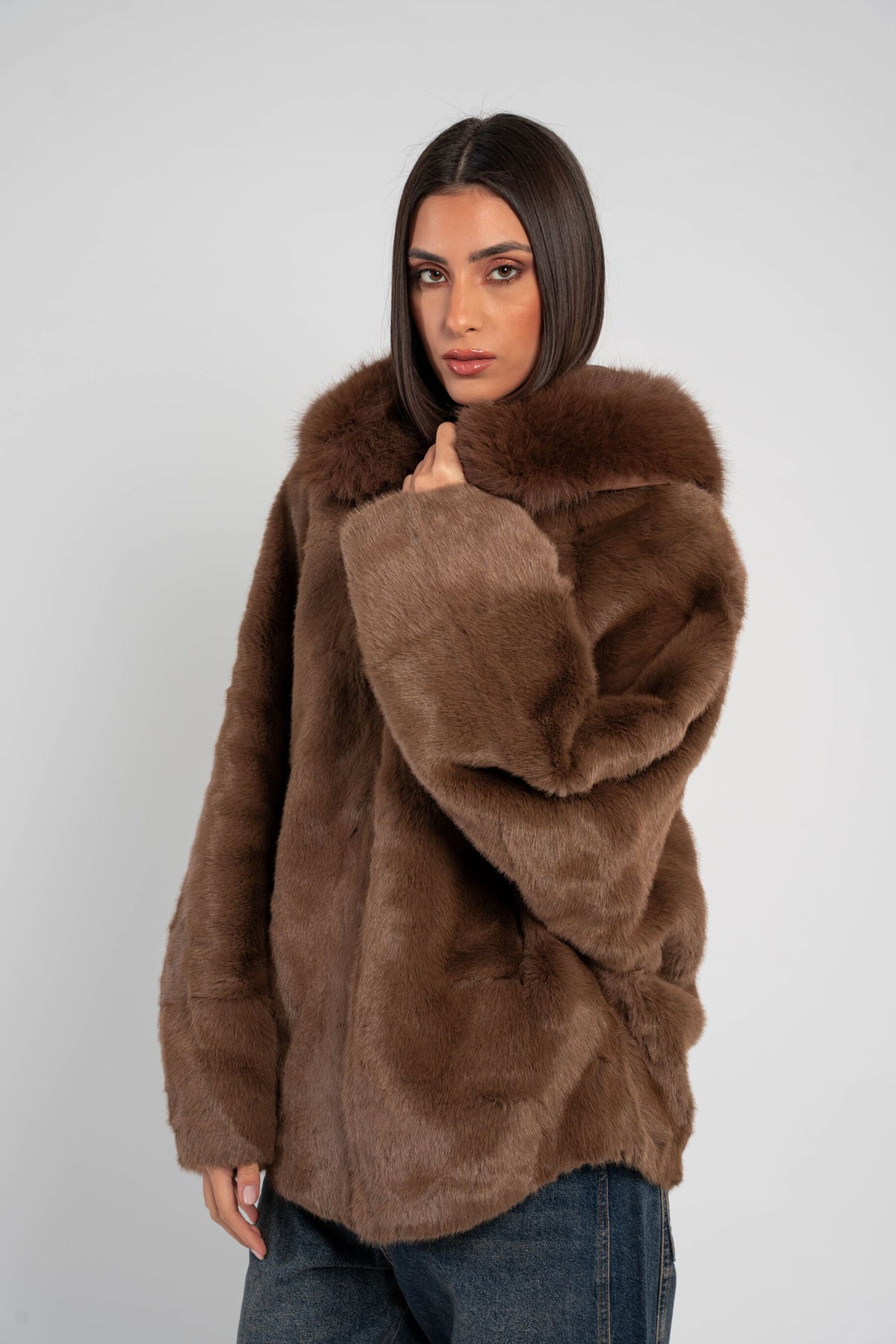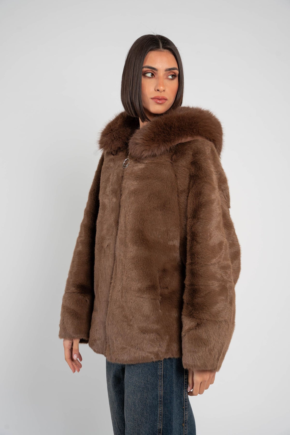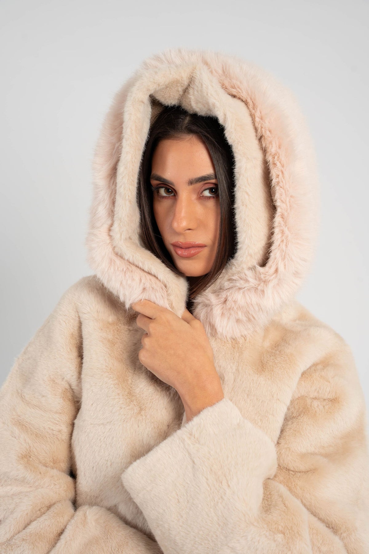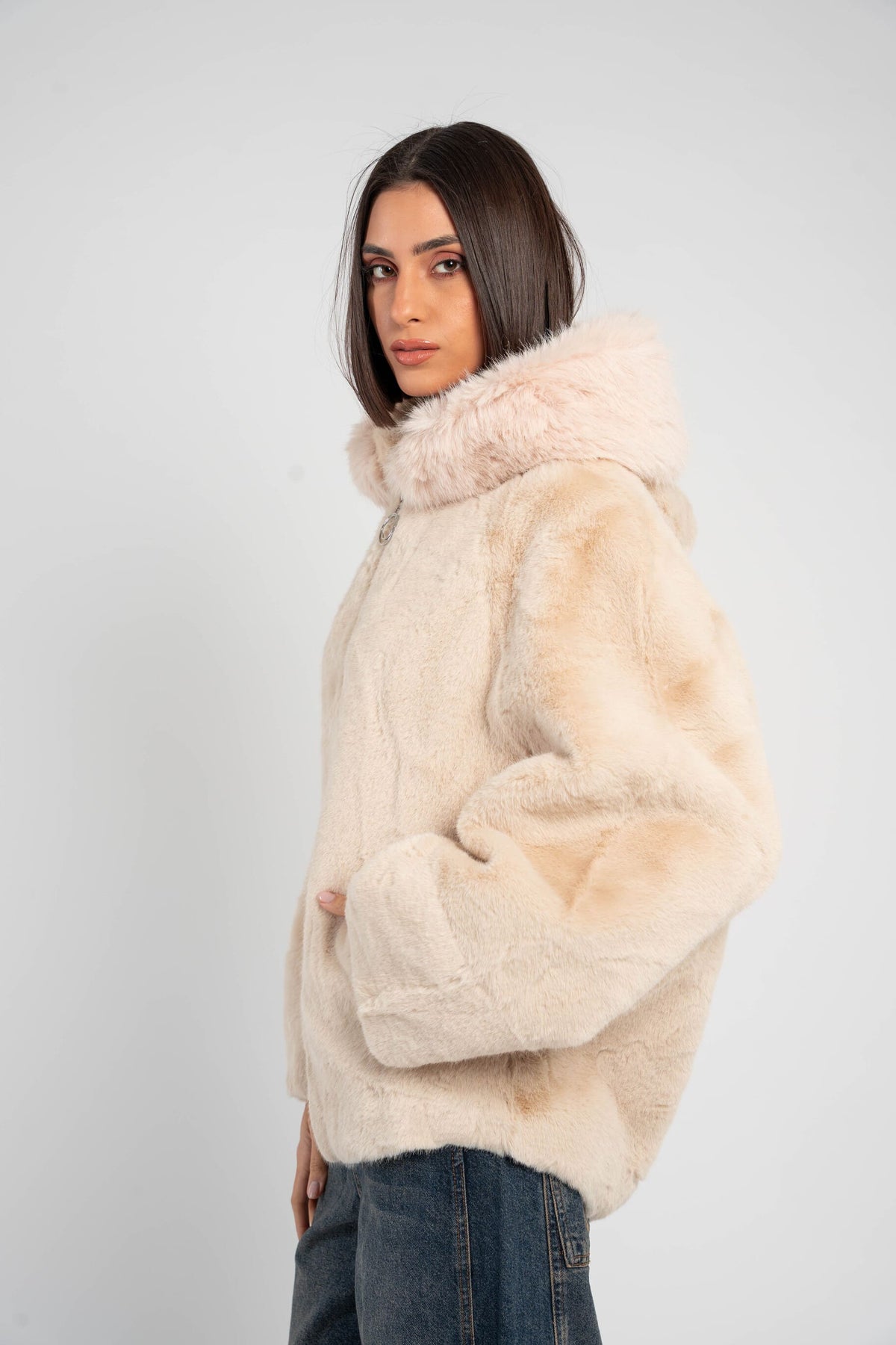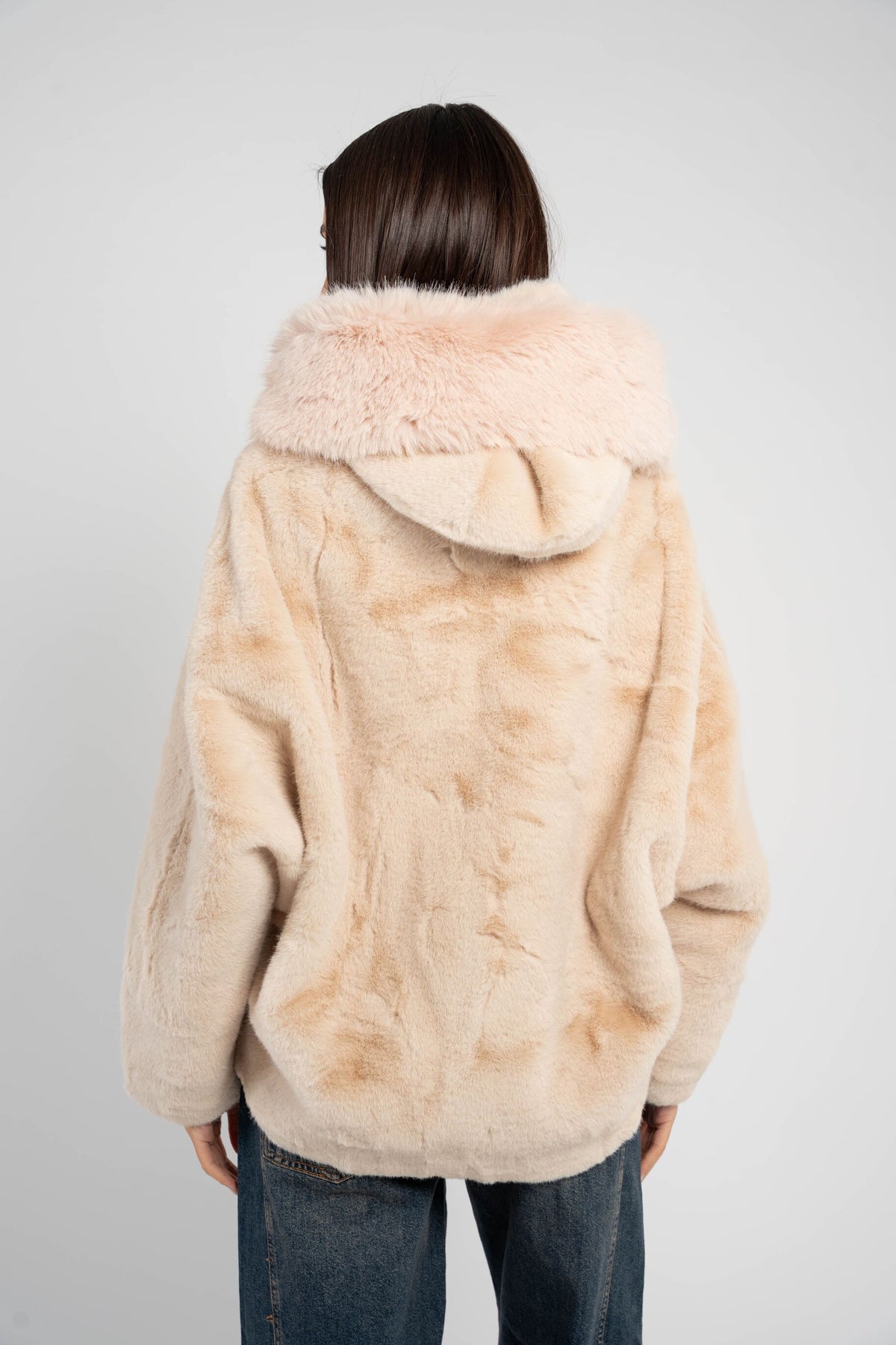 - A cozy faux fur jacket featuring a hooded design, front zip closure, and side pockets