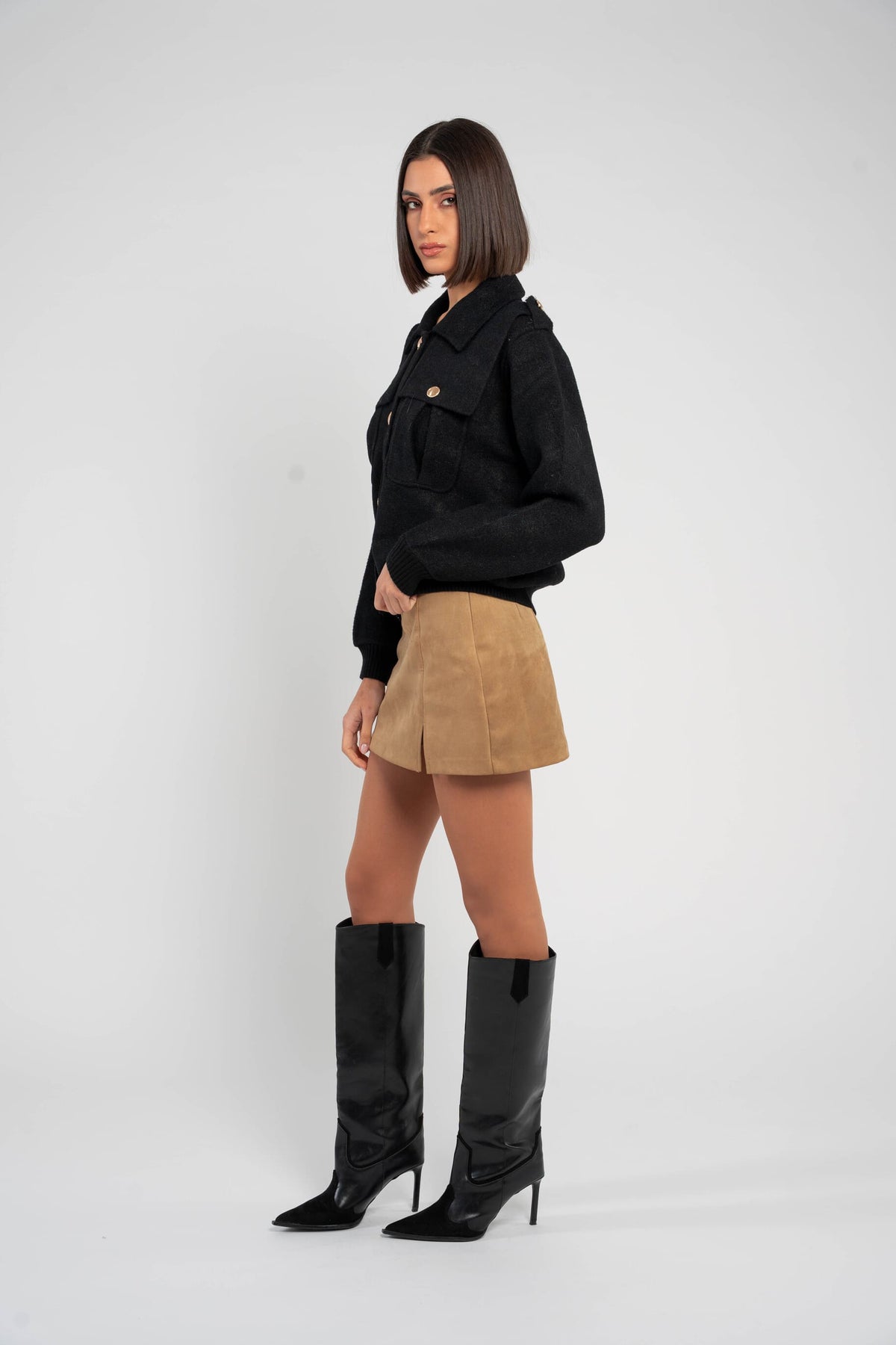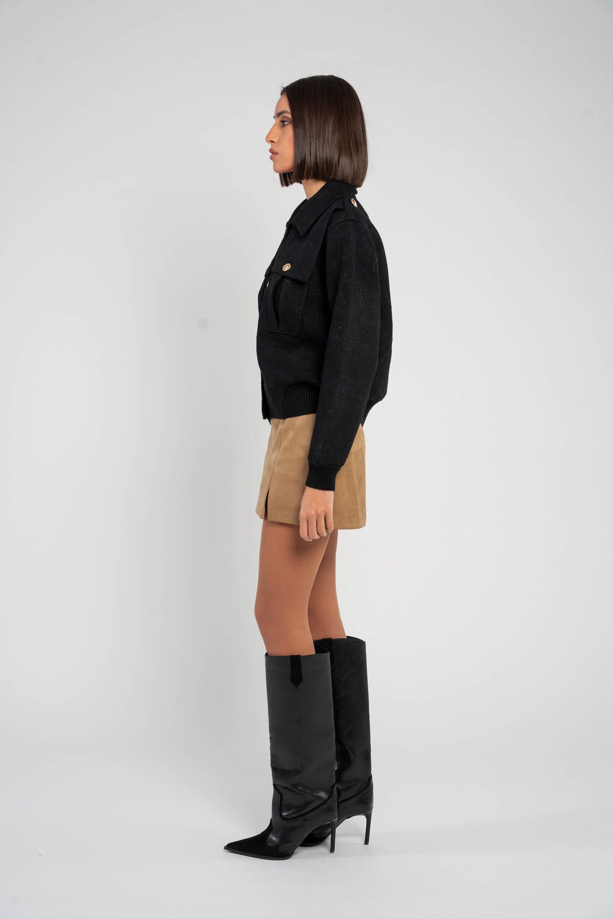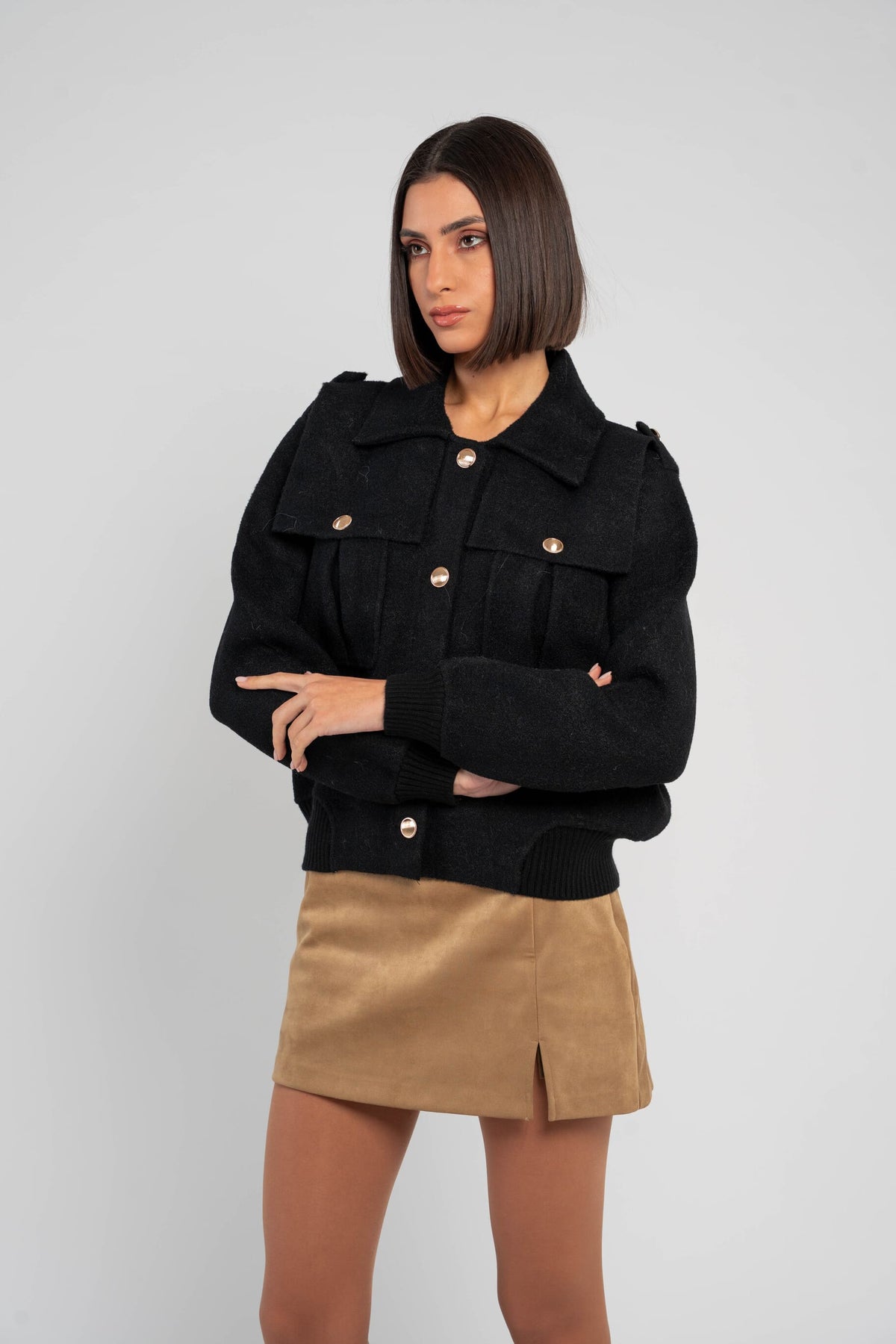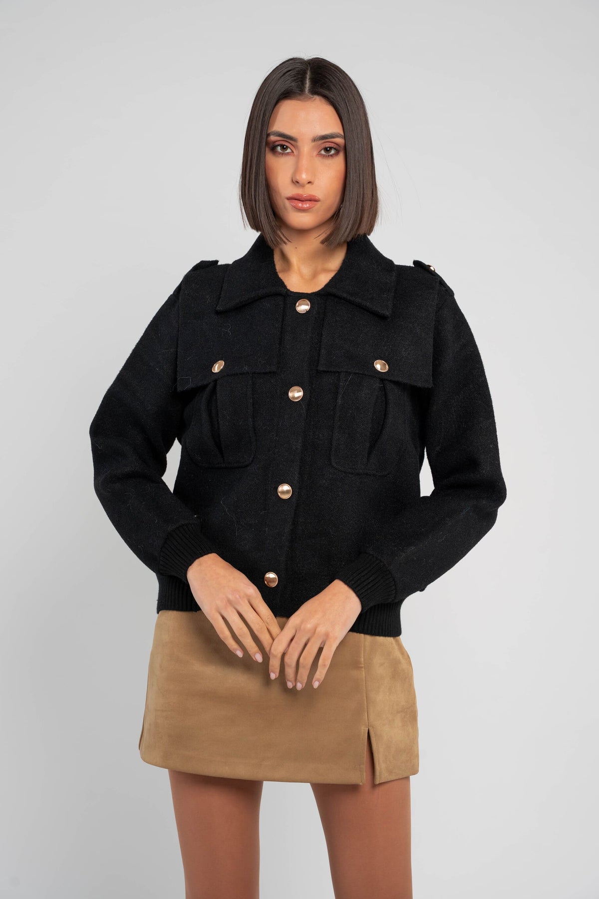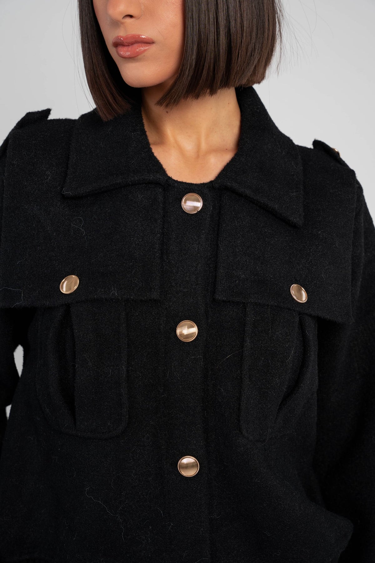 - A structured wool jacket featuring a classic collar, front button fastening, and utility-inspired chest pockets