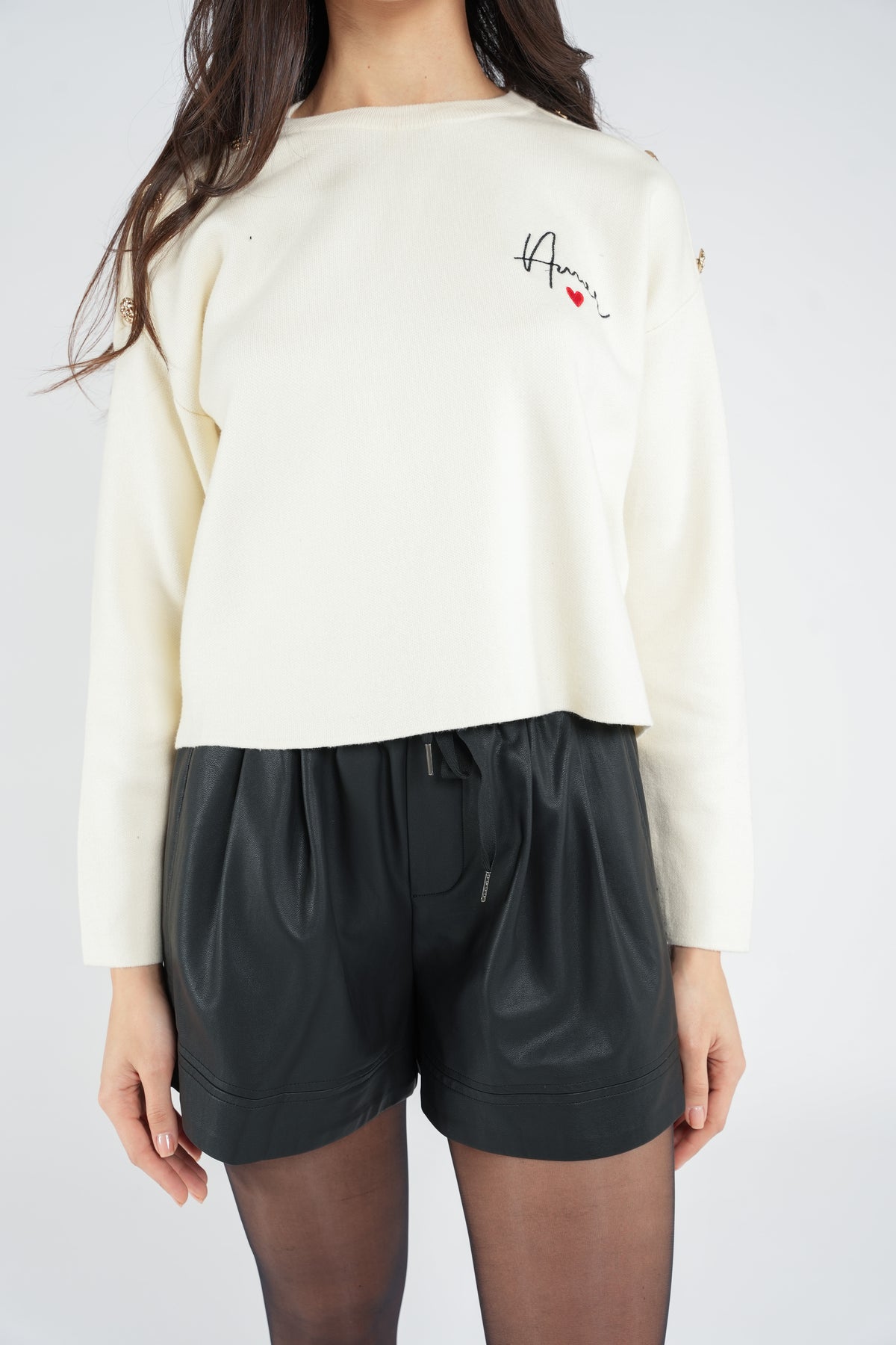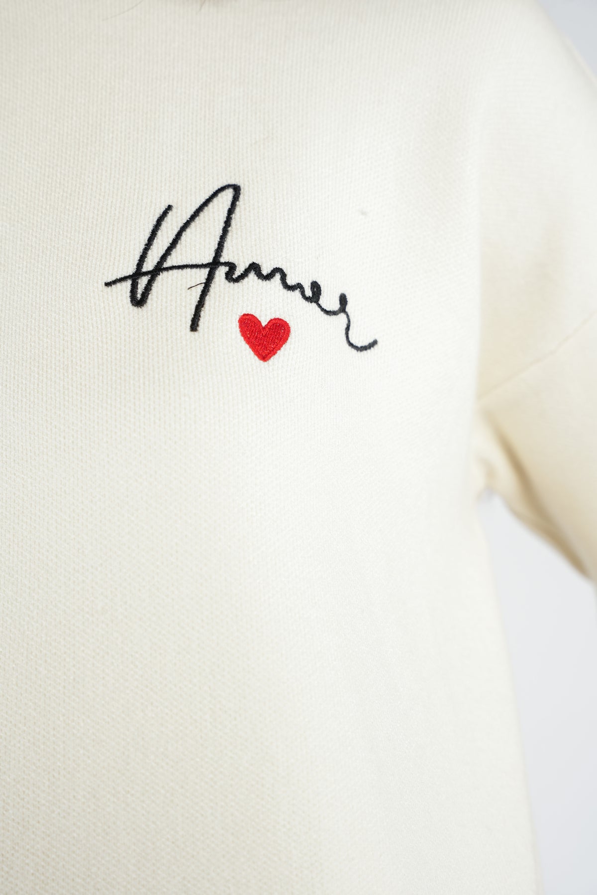 - A slightly oversized sweatshirt with subtle embroidery on the left chest