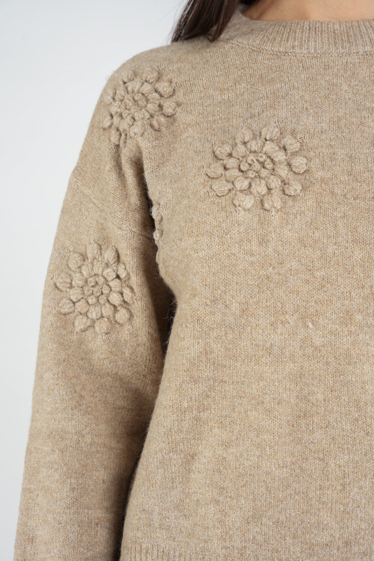 - A knit sweater detailed with 3D floral embellishments on the upper chest and shoulders
